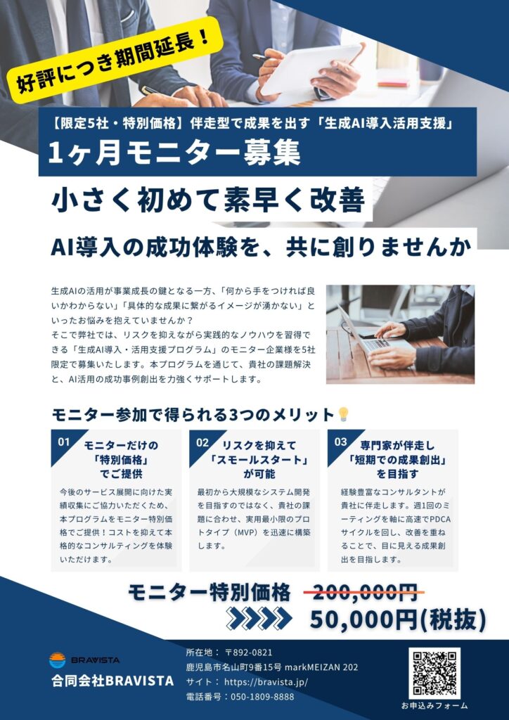 合同会社BRAVISTAでは、そのような企業様がリスクを抑えながらAI活用の第一歩を踏み出せるよう、「生成AI導入活用支援プログラム」のモニター企業様を募集しておりました。
